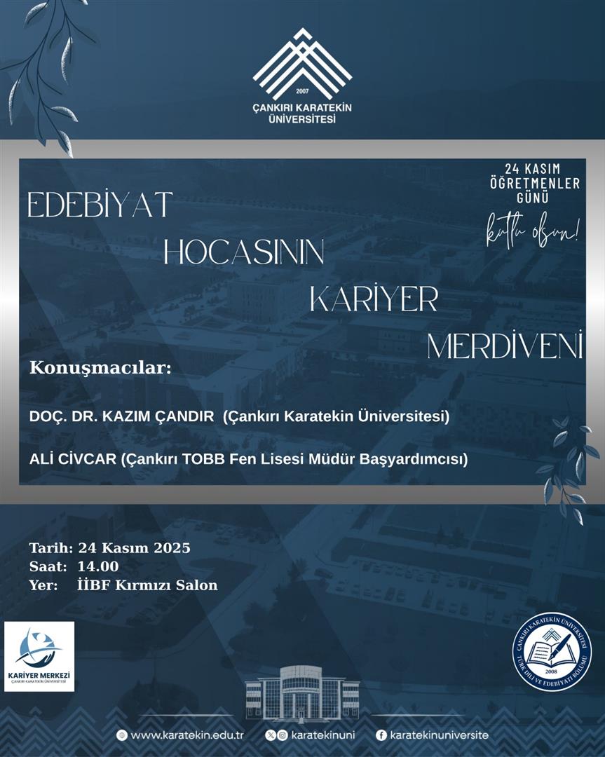 Çankırı Karatekin Üniversitesi Türk Dili ve Edebiyatı Bölümü ile Çankırı Karatekin Üniversitesi Kariyer Merkezi tarafından 24 Kasım Öğretmenler Günü münasebetiyle düzenlenen "Edebiyat Hocasının Kariyer Merdiveni" konulu etkinliğe tüm personelimiz ve öğrencilerimiz davetlidir.