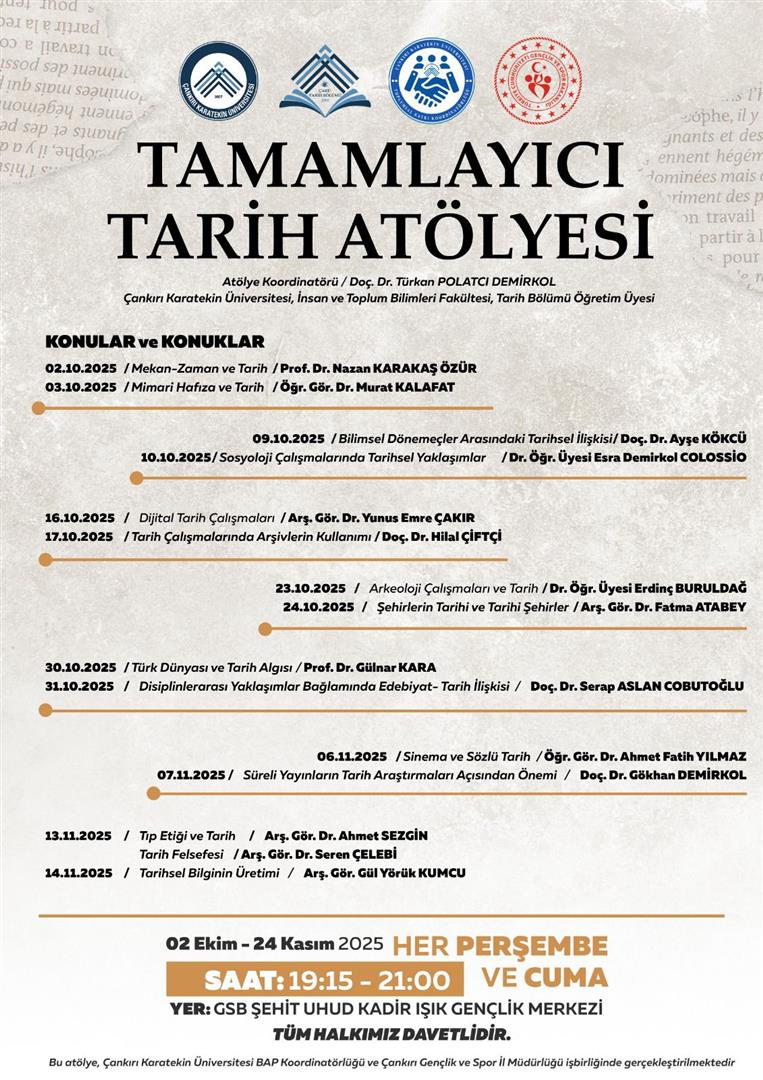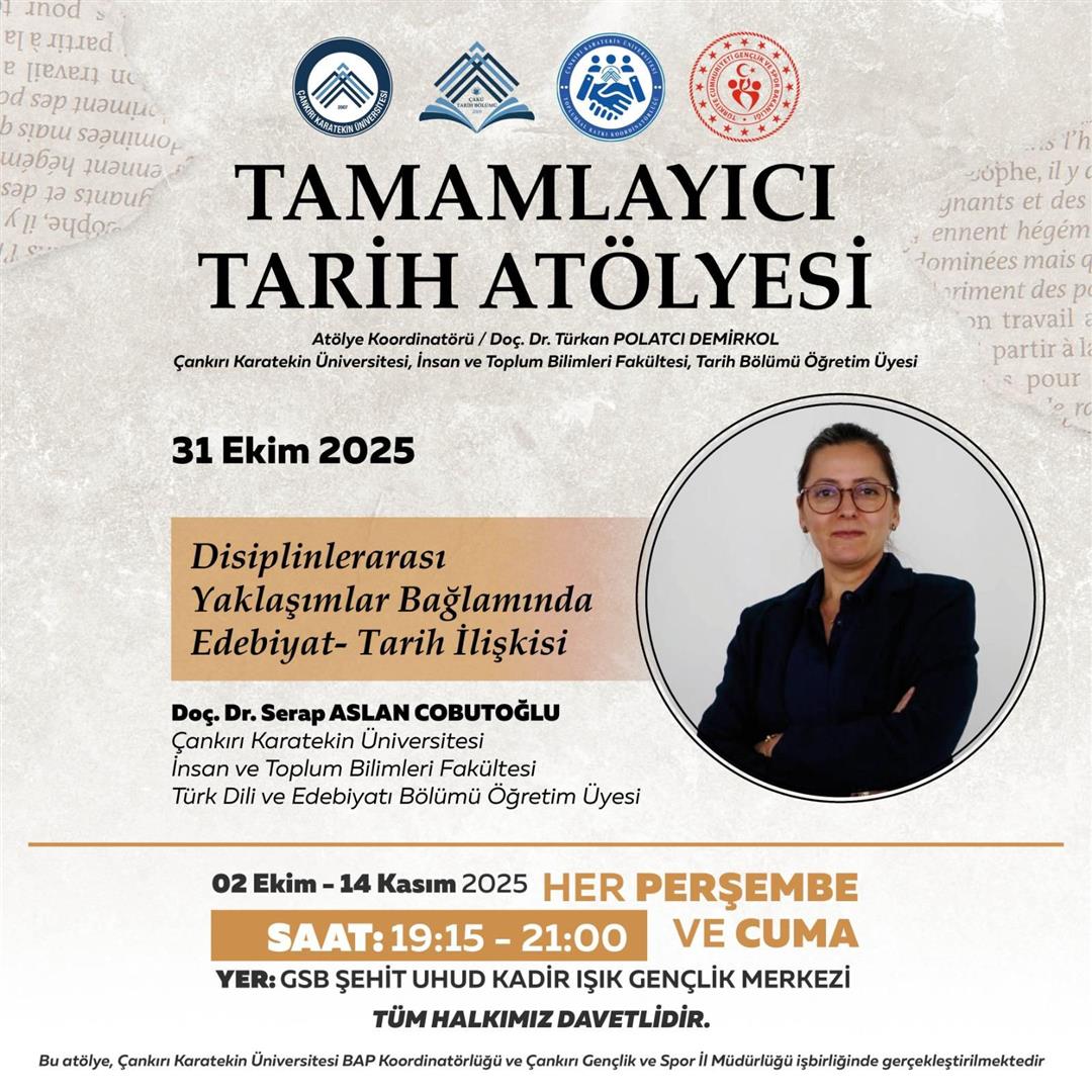 Her hafta Perşembe ve Cuma günleri gerçekleşmekte olan "Tamamlayıcı Tarih Atölyesi" etkinliklerinde bu hafta bölüm başkanımız Doç. Dr. Serap ASLAN COBUTOĞLU "Disiplinlerarası Yaklaşımlar Bağlamında Edebiyat-Tarih İlişkisi" konulu konferans verecektir. Tüm personelimiz ve öğrencilerimiz davetlidir.