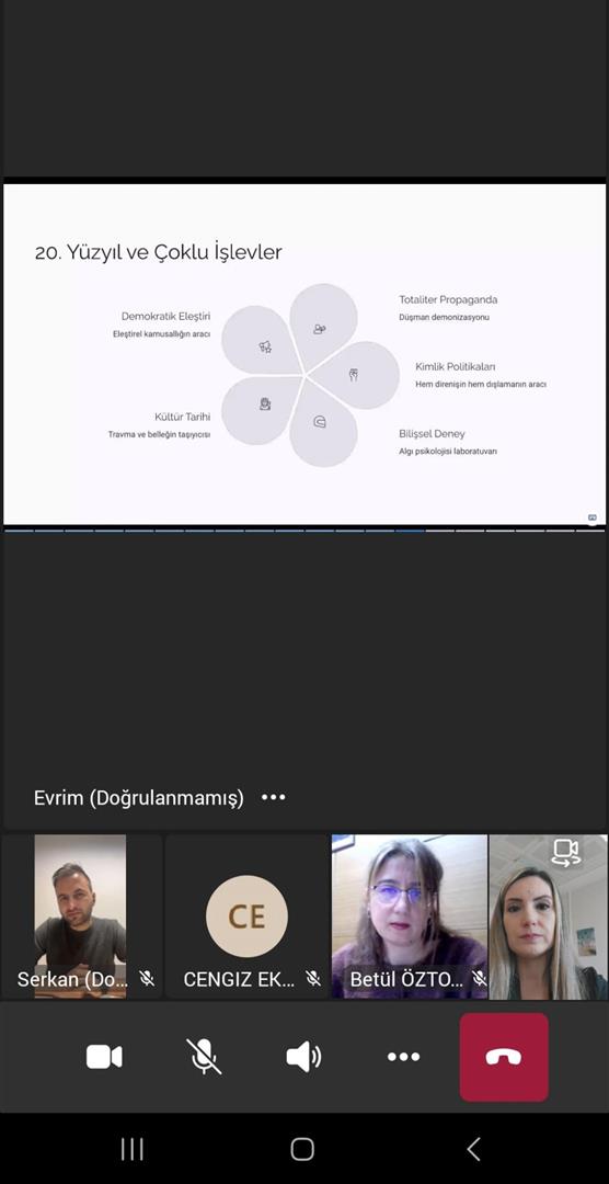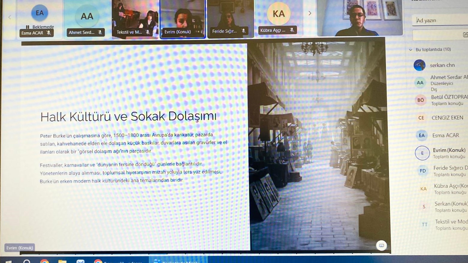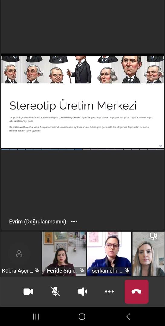 Türk Dili ve Edebiyatı Bölümü ile Gelenekli Türk El Sanatları Uygulama ve Araştırma Merkezi tarafından 19.11.2025 tarihinde Dr. Öğr. Üyesi Evrim Ulusan Öztürkmen`in konuşmacı olarak katıldığı “Karikatürde Mizahın Görsel İnşası: Geleneksel Çizgiden Çağdaş Yoruma” konulu konferans düzenlenmiştir. Etkinlik, Türk Dili ve Edebiyatı Bölüm Başkanı Doç. Dr. Serap Aslan Cobutoğlu moderatörlüğünde çevrim içi olarak gerçekleştirilmiştir.